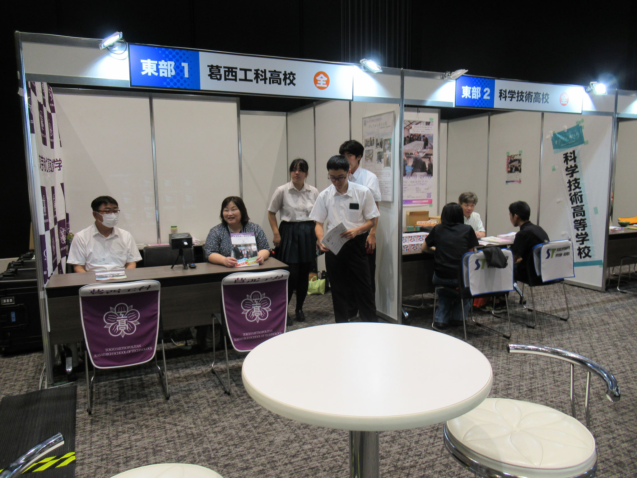 先日令和7年7月27日(日)に新宿の住友ビル1階の三角広場にて「工科高校ドリームフェスタ」が開催されました。都立の工科系の学校が一同に集結して工科高校の魅力をPRしました。会場には朝から大勢の人たちが列を作って入場を待つ姿もありました。葛西工科高校では、VR溶接の体験ブースや、学校説明、ステージでのPRもありました。
